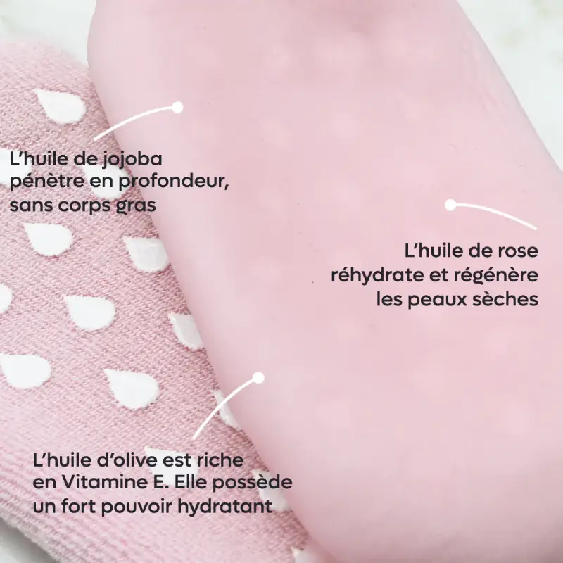 Conçues pour retrouver la douceur et la fraîcheur de vos pieds, la paire de chaussette Gel SPA socks de Yumi Feet sont enrichies en huiles hydratantes et nourrissantes. Leur forme de chaussette permet de maintenir en place le masque de gel qui constitue la doublure intérieure. Ce gel est concentré en huiles essentielles de Rose et huiles végétales d’Olive, de pépins de Raisins et de Jojoba, actifs hautement nourrissants et hydratants pour répondre aux besoins de vos pieds : élimination des cellules mortes, zones de rugosités et callosités pour des pieds doux et confortables. Odeur agréable comme en SPA.