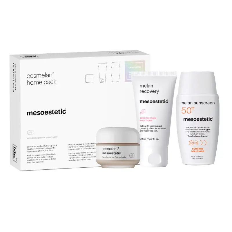 Découvrez Cosmelan Home Pack de Mesoestetic, le pack à utiliser à domicile de la méthode cosmelan®. Contenant les produits pour renforcer le protocole du soin Cosmelan Peel à domicile, ils viennent compléter l’action dépigmentante pour réduire voire éliminer les taches d’origine mélanique définitivement (taches brunes, taches d’hyperpigmentation, mélasma). Ainsi, ces produits de soin professionnels, sont hautement concentrés en actifs spécifiques pour une action ciblée et sûre pour garantir la santé de votre peau.