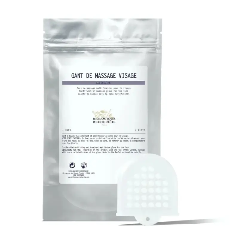 Accessoire de modelage, le gant de Massage Visage de Biologique Recherche est un accessoire indispensable pour un soin skincare parfait. Conçu pour dynamiser le soin en suivant les lignes de force du visage, il est équipé de deux faces : l’une avec des picots épais pour exfolier et préparer la peau, l’autre avec des picots doux pour masser, détendre le tissus facial et favoriser une meilleure absorption des produits tout en stimulant la microcirculation cutanée. Sa matière en silicone permet d’épouser parfaitement les reliefs du visage et vous garantit une maniabilité totale pour un soin visage efficace et des résultats optimaux.