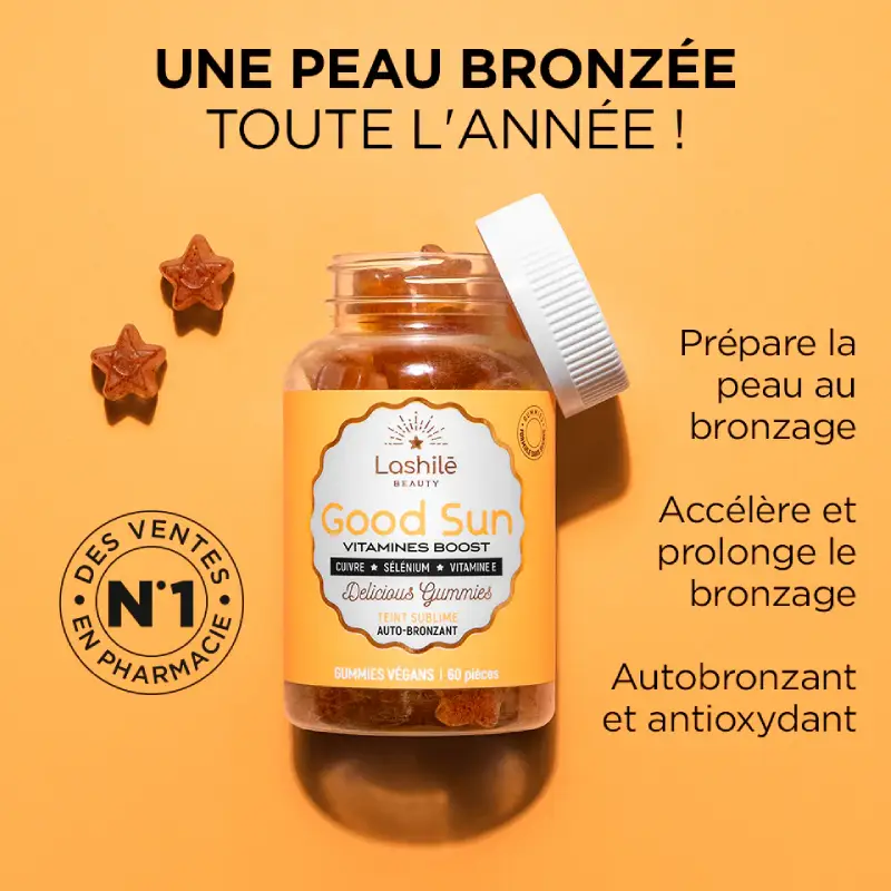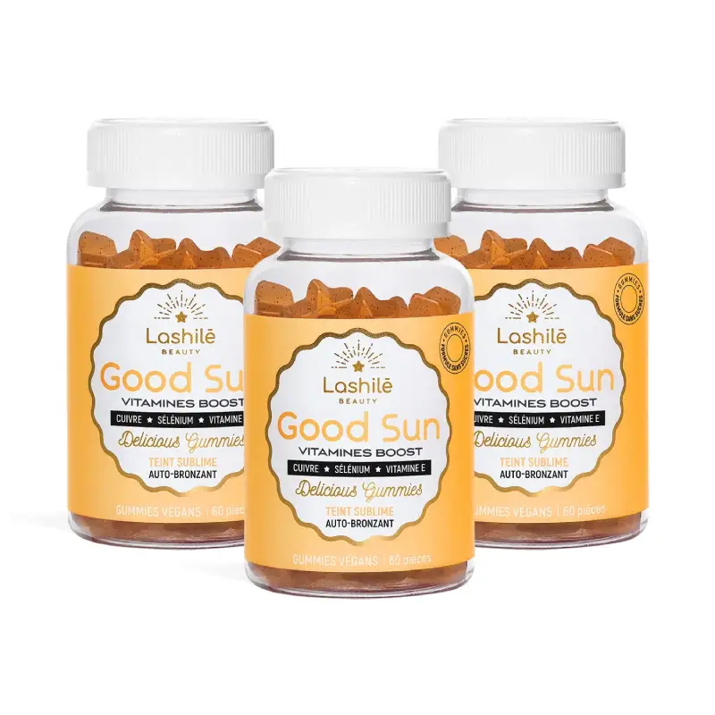 Spécialement formulés pour sublimer le bronzage et permettre d’afficher un ton hâlé et rayonnant tout au long de l’année, les gummies Lashilé Good Sun vont vous apporter du soleil au quotidien! Ses vitamines A et le cuivre contribuent à la pigmentation naturelle de votre peau, alors que ses vitamines E, et les autres oligo-éléments renforcent vos cellules contre le stress oxydatif. Compléments alimentaires formulés SANS SUCRES, uniquement avec des vitamines, des plantes et des minéraux essentiels pour sublimer votre bronzage. Son petit plus: son délicieux goût pêche.